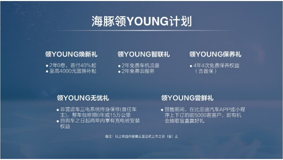 为了减轻年轻用户的购车压力,为首批海豚用户提供更多福利,比亚迪特别推出“海豚领YOUNG计划”。自预售开启之日起,截止至海豚正式上市当日(含),预订海豚的用户可享受包括“2年0息,首付40%起”“至高4,000元置换补贴”在内的多重权益大礼,通过比亚迪汽车APP或小程序下订的前5,000名客户,更有机会抽取盲盒赢好礼。