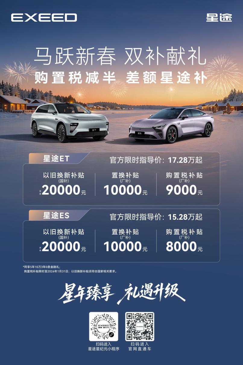 2026年,为激发市场活力、推动汽车产业向绿色与智能化升级,以及减少排放、促进环保,国家“以旧换新”补贴正在持续全面推行,为积极响应国家号召,2026年1月1日起至1月31日,购入星途ET、ES可享至高20000元国补。诚意层层加码,与此同时,星途汽车还为置换用户提供10000元“厂补”,让消费者能够更轻松地享受这两款集成尖端科技与技术的汽车产品。